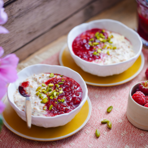 - Disposer le petit épeautre au lait dans des verrines ou bols. Napper généreusement de coulis de framboises. Parsemer d'éclats de pistaches et de quelques framboises.